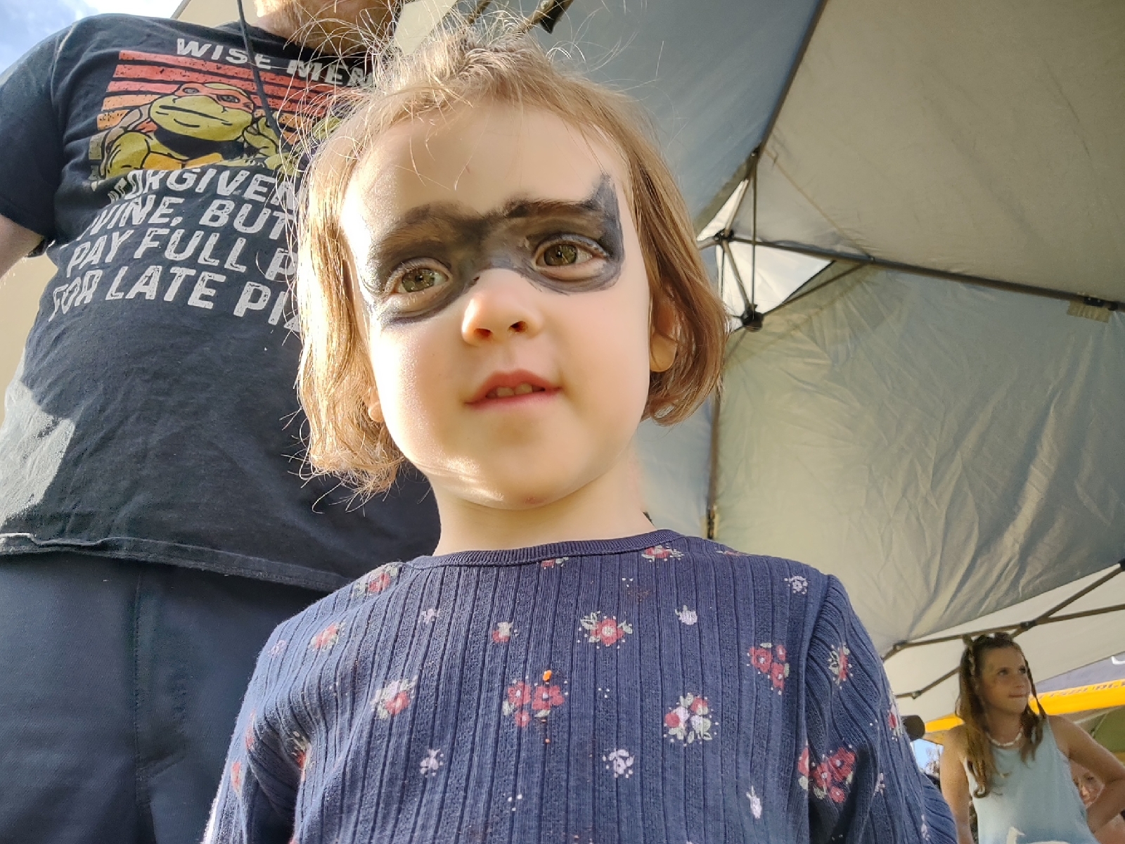 This weekend was good. On Saturday Jeramys sister left and me and we worked on the shed. Luna took a nap and when she woke up we went to the big park. The water was on and she was soaking wet. We went home and warmed up. The. The Grovers had a community party that they invited us to. They spray painted Lunas hair and had face painting. She want to be Batman. Lol then today the gang came by and picked up Luna and took her to the aquarium. Me and Jeramy finish wrapping the shed. We just need to put up the decorative panelling next. I also bought some things for Halloween. For our house I bought a dinosaur that looks like it's coming out of the window. Since Luna is afraid of everything I went light in spooky. She is just pretending being scared in the picture.I need to pull out the rest of my stuff